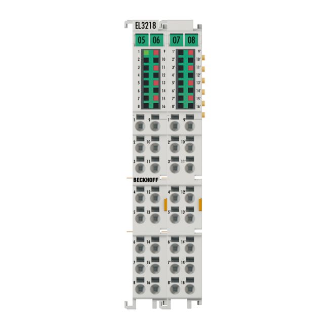EL3218 | EtherCAT Terminal, 8-channel analog input, temperature, RTD (Pt100), 16 bit, 3-wire connection EL3218 | EtherCAT Terminal, 8-channel analog input, temperature, RTD (Pt100), 16 bit, 3-wire connection SKU: EL3218 Hãng sản xuất: Beckhoff Chất lượng: Mới 100% Bảo hành: Chính hãng Chứng từ: CO/CQ, hóa đơn VAT Mua Ngay : nhà chế tạo: Beckhoff SKU: EL3218 Ngày giao hàng: 1-3 days 1.000 ₫ Số lượng: Thêm vào giỏ hàng Giao đến Chọn quốc gia Vietnam Vietnam * Khác * Phương pháp vận chuyển Tên Ngày dự kiến giao hàng Giá bán Không có tùy chọn giao hàng nào Áp dụng Custom wishlist được Thêm vào danh sách yêu thích Thêm vào danh sách so sánh EL3218 | EtherCAT Terminal, 8-channel analog input, temperature, RTD (Pt100), 16 bit, 3-wire connectionThông Tin Chi Tiết Sản PhẩmTechnical dataEL3218Number of inputs8Power supplyvia the E-busTechnology2-/3-wireSignal typedifferentialDistributed clocks–Input filter limit frequencytyp. 1 kHzSensor typesPt100, Pt200, Pt500, Pt1000, Ni100, Ni120, Ni1000, resistance measurement (e.g. potentiometer, 10 ?…1/4 k?), KTY sensors (types see documentation)Connection method2- or 3-wire (default: 3-wire)Conversion timeapprox. 170 ms default settingMeasuring current< 0.5 mA (load-dependent)Measuring range-200…+850 °C (Pt sensors); -60…+250 °C (Ni sensors)Temperature range-200…+850 °C (Pt sensors); -60…+250 °C (Ni sensors)Resolution0.1 °C or 0.01 °C per digitMeasuring error< ±0.5 °C for Pt sensors, 8 x 3-wire connectionElectrical isolation500 V (E-bus/signal voltage)Current consumption power contacts–Current consumption E-bustyp. 120 mASpecial featuresintegrated digital filter, limit value monitoring, variable connection technologyWeightapprox. 60 gOperating/storage temperature-25…+60 °C/-25…+85 °CRelative humidity95 %, no condensationVibration/shock resistanceconforms to EN 60068-2-6/EN 60068-2-27EMC immunity/emissionconforms to EN 61000-6-2/EN 61000-6-4Protect. class/installation pos.IP 20/variableApprovals/markingsCE>Sản Phẩm Liên QuanThương hiệuBeckhoffThời gian bảo hành1 Năm Thẻ sản phẩm Cầu đấu dây (992) , Beckhoff (1997)