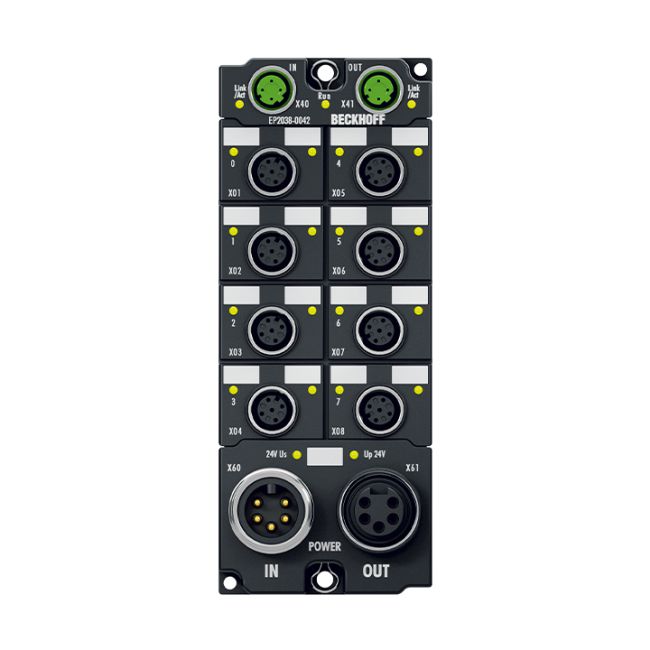 EP2038-0042 | EtherCAT Box, 8-channel digital output, 24 V DC, 2 A, M12, with diagnostics EP2038-0042 | EtherCAT Box, 8-channel digital output, 24 V DC, 2 A, M12, with diagnostics SKU: EP2038-0042 Hãng sản xuất: Beckhoff Chất lượng: Mới 100% Bảo hành: Chính hãng Chứng từ: CO/CQ, hóa đơn VAT Mua Ngay : nhà chế tạo: Beckhoff SKU: EP2038-0042 Ngày giao hàng: 1-3 days 1.000 ₫ Số lượng: Thêm vào giỏ hàng Giao đến Chọn quốc gia Vietnam Vietnam * Khác * Phương pháp vận chuyển Tên Ngày dự kiến giao hàng Giá bán Không có tùy chọn giao hàng nào Áp dụng Custom wishlist được Thêm vào danh sách yêu thích Thêm vào danh sách so sánh EP2038-0042 | EtherCAT Box, 8-channel digital output, 24 V DC, 2 A, M12, with diagnosticsThông Tin Chi Tiết Sản PhẩmTechnical dataEP2038-0042ProtocolEtherCATBus interface2 x M12 socket, 4-pin (D-coded)Number of outputs8Output connectionsM12, screw typeLoad typeohmic, inductive, lamp load up to max. 24 WNominal output voltage24 V DC (-15 %/+20 %)Max. output current2.4 A per channel, individually short-circuit proof, total current max. 16 AShort-circuit currentmax. 14 ADistributed clocksyesCurrent consumption from UStyp. 130 mAAuxiliary power currenttyp. 20 mA + loadDiagnosticsshort circuit, open load detection, undervoltagePower supply connectionfeed: 1 x 7/8″ plug, 5-pin; downstream connection: 1 x 7/8″ socket, 5-pinElectrical isolation500 VWeightapprox. 440 gOperating/storage temperature-25…+60 °C/-40…+85 °CVibration/shock resistanceconforms to EN 60068-2-6/EN 60068-2-27EMC immunity/emissionconforms to EN 61000-6-2/EN 61000-6-4Protect. class/installation pos.IP 65/66/67 (conforms to EN 60529)/variableApprovals/markingsCE, UL in preparation>Sản Phẩm Liên QuanThương hiệuBeckhoffThời gian bảo hành1 Năm Thẻ sản phẩm REMOTE I/O (1489) , Beckhoff (1997)