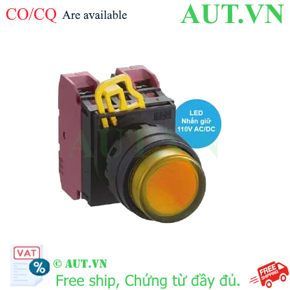 Spec: Có đèn; 110VAC; D22; Màu hổ phách; 2NC; Nhấn giữ; Round extended; Chất liệu vỏ: Plastic; Chất liệu vòng bezel: Plastic