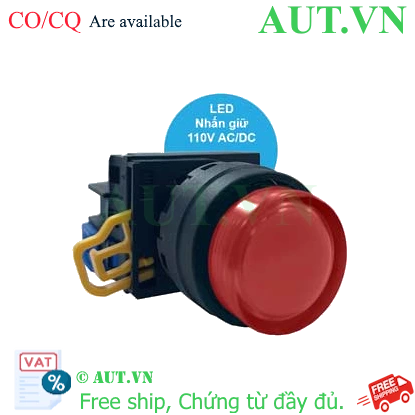 Spec: Có đèn; 110VAC; D22; Đỏ; 1NO; Nhấn giữ; Round extended; Chất liệu vỏ: Plastic; Chất liệu vòng bezel: Plastic