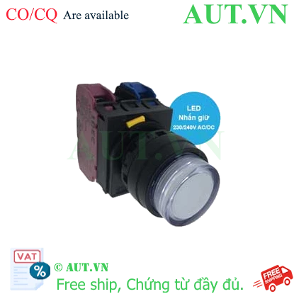 Spec: Có đèn; 230VAC, 240VAC; D22; Trắng; 1NO+1NC; Nhấn giữ; Round extended; Chất liệu vỏ: Plastic; Chất liệu vòng bezel: Plastic