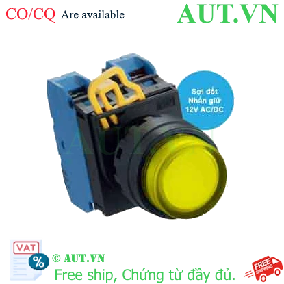 Spec: Có đèn; 12VAC, 12VDC; D22; Vàng; 2NO; Nhấn giữ; Round extended; Chất liệu vỏ: Plastic; Chất liệu vòng bezel: Plastic