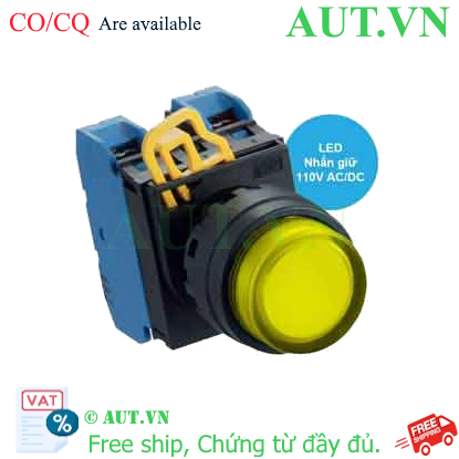 Spec: Có đèn; 110VAC; D22; Vàng; 2NO; Nhấn giữ; Round extended; Chất liệu vỏ: Plastic; Chất liệu vòng bezel: Plastic