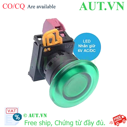 Spec: Có đèn; 6VAC, 6VDC; D22; Xanh lá; 1NC; Nhấn giữ; Mushroom; Chất liệu vỏ: Plastic; Chất liệu vòng bezel: Plastic
