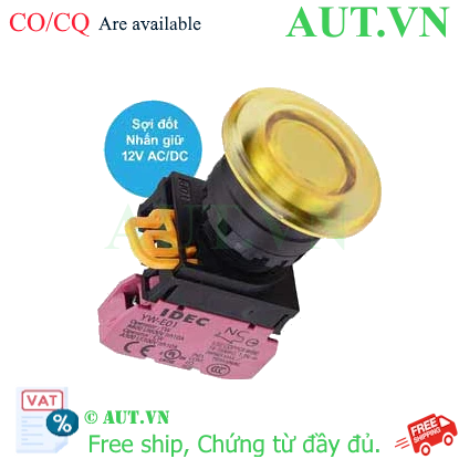 Spec: Có đèn; 12VAC, 12VDC; D22; Vàng; 1NC; Nhấn giữ; Mushroom; Chất liệu vỏ: Plastic; Chất liệu vòng bezel: Plastic