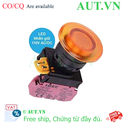Spec: Có đèn; 110VAC; D22; Màu hổ phách; 1NC; Nhấn giữ; Mushroom; Chất liệu vỏ: Plastic; Chất liệu vòng bezel: Plastic