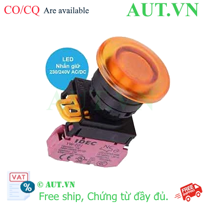 Spec: Có đèn; 230VAC, 240VAC; D22; Màu hổ phách; 1NC; Nhấn giữ; Mushroom; Chất liệu vỏ: Plastic; Chất liệu vòng bezel: Plastic