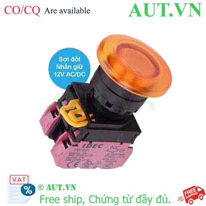 Spec: Có đèn; 12VAC, 12VDC; D22; Màu hổ phách; 2NC; Nhấn giữ; Mushroom; Chất liệu vỏ: Plastic; Chất liệu vòng bezel: Plastic