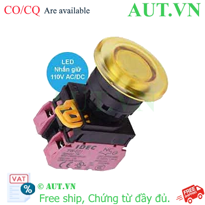 Spec: Có đèn; 110VAC; D22; Vàng; 2NC; Nhấn giữ; Mushroom; Chất liệu vỏ: Plastic; Chất liệu vòng bezel: Plastic