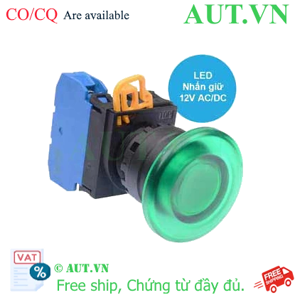 Spec: Có đèn; 12VAC, 12VDC; D22; Xanh lá; 1NO; Nhấn giữ; Mushroom; Chất liệu vỏ: Plastic; Chất liệu vòng bezel: Plastic