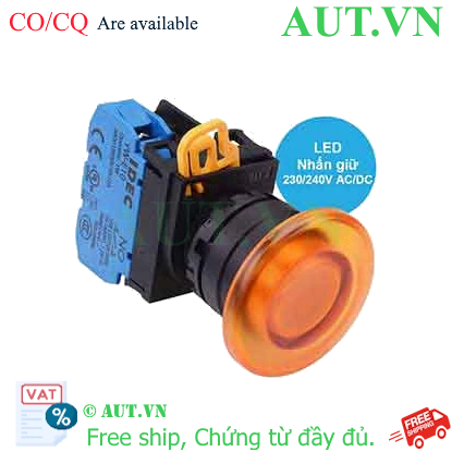 Spec: Có đèn; 230VAC, 240VAC; D22; Màu hổ phách; 1NO; Nhấn giữ; Mushroom; Chất liệu vỏ: Plastic; Chất liệu vòng bezel: Plastic