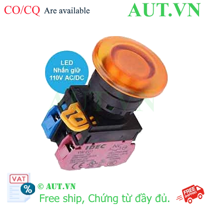 Spec: Có đèn; 110VAC; D22; Màu hổ phách; 1NO+1NC; Nhấn giữ; Mushroom; Chất liệu vỏ: Plastic; Chất liệu vòng bezel: Plastic