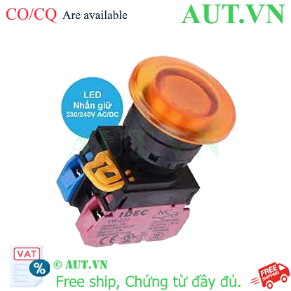 Spec: Có đèn; 230VAC, 240VAC; D22; Màu hổ phách; 1NO+1NC; Nhấn giữ; Mushroom; Chất liệu vỏ: Plastic; Chất liệu vòng bezel: Plastic