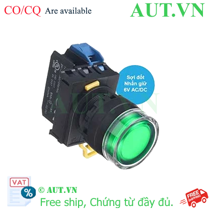 Spec: Có đèn; 6VAC, 6VDC; D22; Xanh lá; 1NO; Nhấn giữ; Round full-guard (Flush); Chất liệu vỏ: Plastic; Chất liệu vòng bezel: Plastic