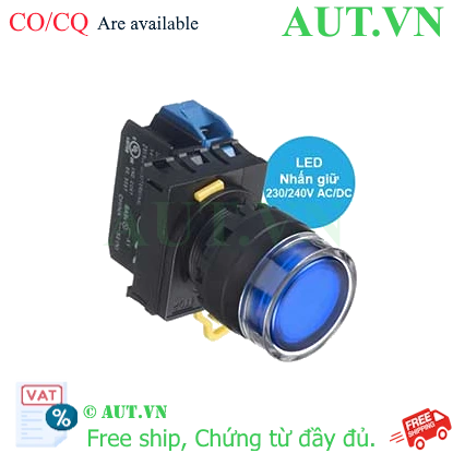 Spec: Có đèn; 230VAC, 240VAC; D22; Xanh da trời; 1NO; Nhấn giữ; Round full-guard (Flush); Chất liệu vỏ: Plastic; Chất liệu vòng bezel: Plastic