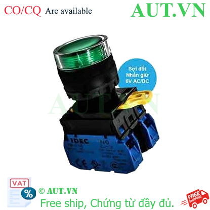 Spec: Có đèn; 6VAC, 6VDC; D22; Xanh lá; 2NO; Nhấn giữ; Round full-guard (Flush); Chất liệu vỏ: Plastic; Chất liệu vòng bezel: Plastic