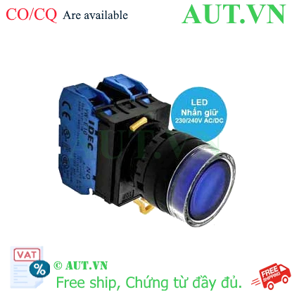 Spec: Có đèn; 230VAC, 240VAC; D22; Xanh da trời; 2NO; Nhấn giữ; Round full-guard (Flush); Chất liệu vỏ: Plastic; Chất liệu vòng bezel: Plastic