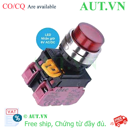 Spec: Có đèn; 6VAC, 6VDC; D22; Đỏ; 2NC; Nhấn giữ; Round extended; Chất liệu vỏ: Plastic; Chất liệu vòng bezel: Metal