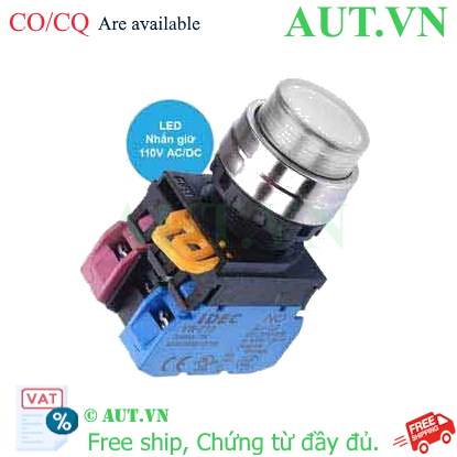 Spec: Có đèn; 110VAC; D22; Trắng; 1NO+1NC; Nhấn giữ; Round extended; Chất liệu vỏ: Plastic; Chất liệu vòng bezel: Metal