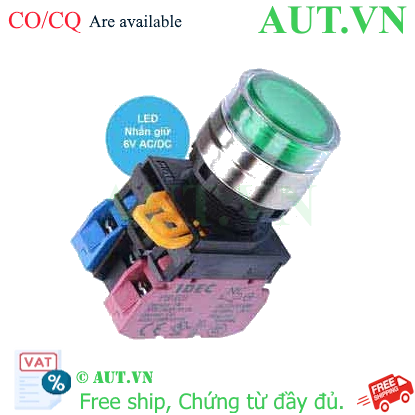 Spec: Có đèn; 6VAC, 6VDC; D22; Xanh lá; 1NO+1NC; Nhấn giữ; Round full-guard (Flush); Chất liệu vỏ: Plastic; Chất liệu vòng bezel: Metal
