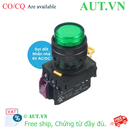 Spec: Có đèn; 6VAC, 6VDC; D22; Xanh lá; 1NC; Nhấn nhả; Round extended; Chất liệu vỏ: Plastic; Chất liệu vòng bezel: Plastic