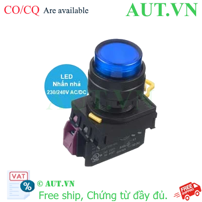 Spec: Có đèn; 230VAC, 240VAC; D22; Xanh da trời; 1NC; Nhấn nhả; Round extended; Chất liệu vỏ: Plastic; Chất liệu vòng bezel: Plastic