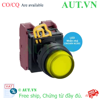 Spec: Có đèn; 230VAC, 240VAC; D22; Vàng; 2NC; Nhấn nhả; Round extended; Chất liệu vỏ: Plastic; Chất liệu vòng bezel: Plastic
