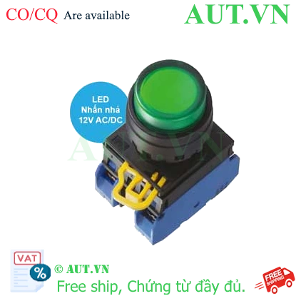 Spec: Có đèn; 12VAC, 12VDC; D22; Xanh lá; 2NO; Nhấn nhả; Round extended; Chất liệu vỏ: Plastic; Chất liệu vòng bezel: Plastic