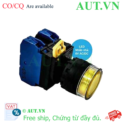 Spec: Có đèn; 6VAC, 6VDC; D22; Vàng; 2NO; Nhấn nhả; Round full-guard (Flush); Chất liệu vỏ: Plastic; Chất liệu vòng bezel: Plastic