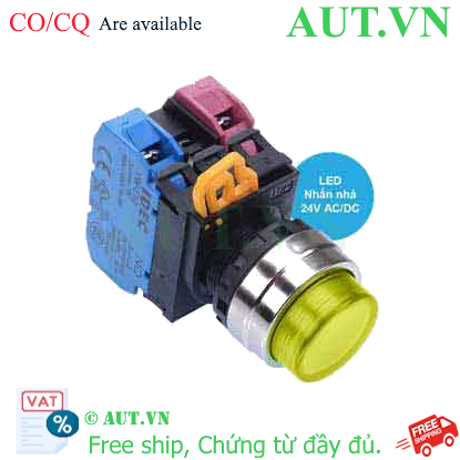Spec: Có đèn; 24VAC, 24VDC; D22; Vàng; 1NO+1NC; Nhấn nhả; Round extended; Chất liệu vỏ: Plastic; Chất liệu vòng bezel: Metal