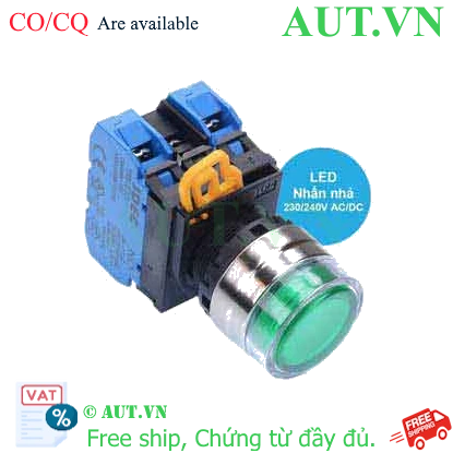 Spec: Có đèn; 230VAC, 240VAC; D22; Xanh lá; 2NO; Nhấn nhả; Round full-guard (Flush); Chất liệu vỏ: Plastic; Chất liệu vòng bezel: Metal