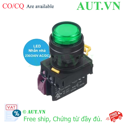 Spec: Có đèn; 230VAC, 240VAC; D22; Xanh lá; 1NC; Nhấn nhả; Round extended; Chất liệu vỏ: Plastic; Chất liệu vòng bezel: Plastic