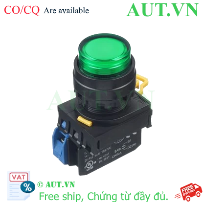 Spec: Có đèn; 230VAC, 240VAC; D22; Xanh lá; 1NO; Nhấn nhả; Round extended; Chất liệu vỏ: Plastic; Chất liệu vòng bezel: Plastic