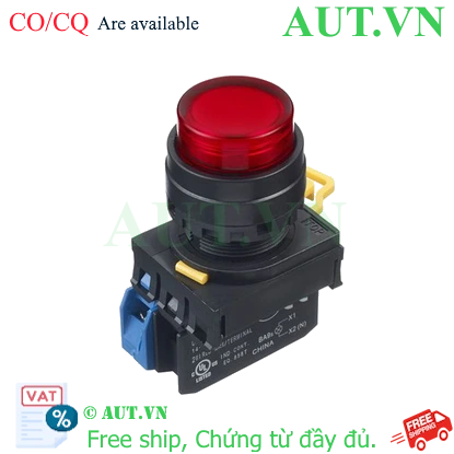Spec: Có đèn; 230VAC, 240VAC; D22; Đỏ; 1NO+1NC; Nhấn nhả; Round extended; Chất liệu vỏ: Plastic; Chất liệu vòng bezel: Plastic