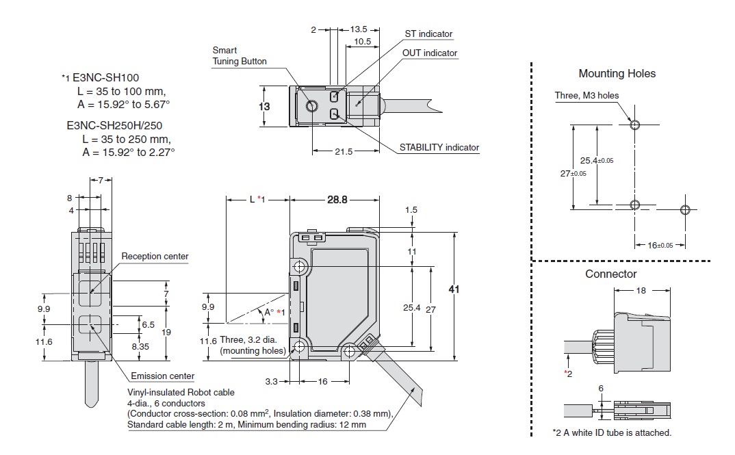 Cảm Biến Lazer Omron E3NC-SH250H 2M Smart Laser Sensor Ultra-compact CMOS Laser Sensor Sensor Head Sensing distance: 35 to 250 mm Class 2 Cable length 2 m