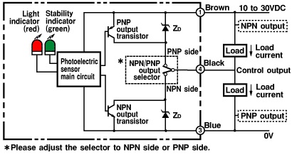 | Control output | NPN/PNP open collector (selectable)30 VDC max.100 mA max.Residual voltage: 1.2 V max. (NPN output)Residual voltage: 2 V max. (PNP output) |