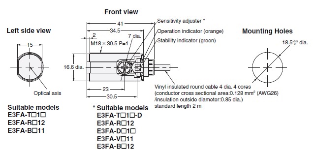 Cảm biến quang điện Omron E3FA-RP12 2M Photoelectric Sensor Retro-reflective type with MSR function Sensing distance: 0 to 500 mm (when using E39-R1S) PNP output Pre-wired 2 m