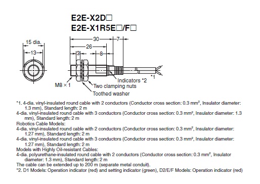 | Material | Case: Stainless steel (SUS303)Sensing surface: Polybutylene terephthalate (PBT)Cable: PVCClamping nuts: Brass nickel platingToothed washers: Iron zinc plating |