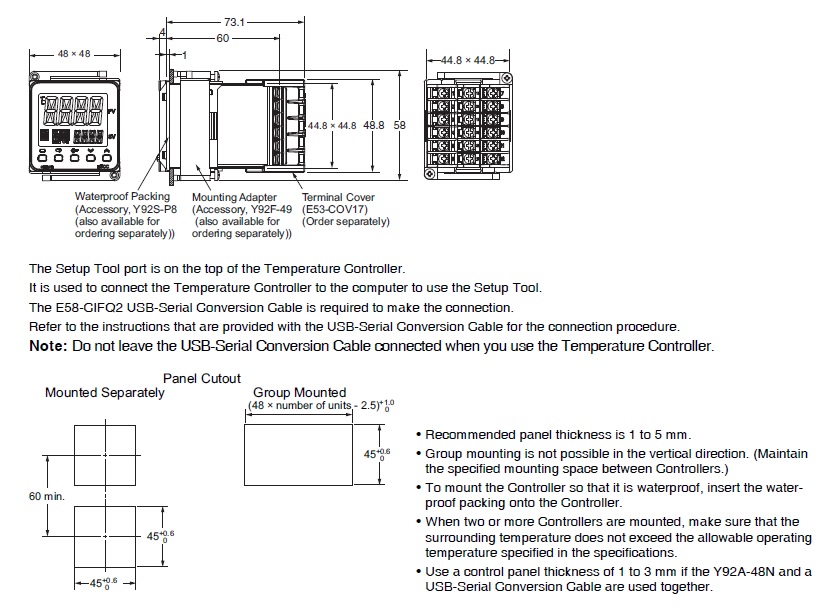 | Sold separately | USB Serial Conversion Cable: E58-CIFQ2Terminal Cover: E53-COV17/E53-COV23Waterproof packing: Y92S-P8Adapter: Y92F-45/Y92F-49Waterproof Cover: Y92A-48NDIN track mounting adapter: Y92F-52Hard Front Cover: Y92A-48HSoft Front Cover: Y92A-48DCX-Thermo Support Software: EST2-2C-MV4Current Transformer (CT): E54-CT1/E54-CT1L/E54-CT3/E54-CT3L |