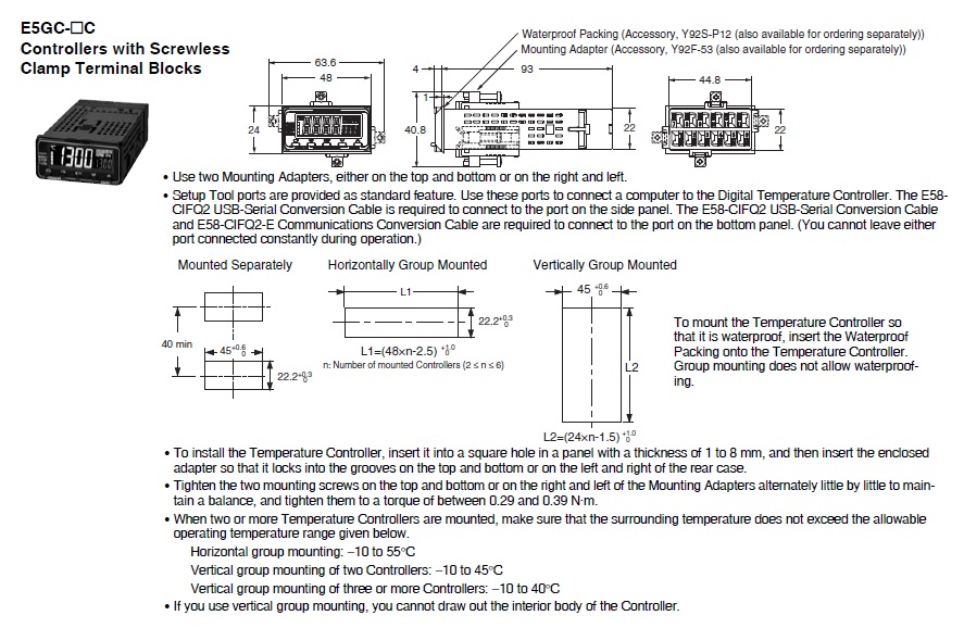| Sold separately | USB Serial Conversion Cable: E58-CIFQ2Communications Conversion Cable: E58-CIFQ2-EWaterproof packing: Y92S-P12Adapter: Y92F-53Draw-out Jig: Y92F-55CX-Thermo Support Software: EST2-2C-MV4 |