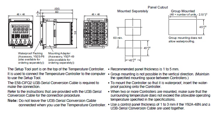 | Sold separately | USB Serial Conversion Cable: E58-CIFQ2Terminal Cover: E53-COV17/E53-COV23Waterproof packing: Y92S-P8Adapter: Y92F-45/Y92F-49Waterproof Cover: Y92A-48NDIN track mounting adapter: Y92F-52Hard Front Cover: Y92A-48HSoft Front Cover: Y92A-48DCX-Thermo Support Software: EST2-2C-MV4 |
