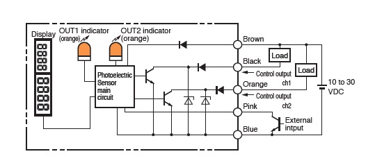 | Control output | NPN open collector30 V max.DCLoad current: 100 mA max. (Groups of 1 to 3 units)/20 mA max. (at 4 or more units are connected)Residual voltage: 1 V max. (10 mA max.)/2 V max. (10 to 100 mA)OFF current: 0.1 mA max. |