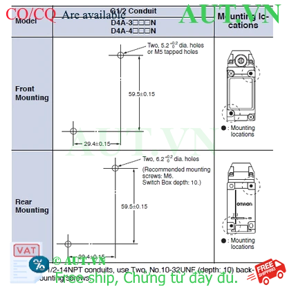 Công tắc hành trình Limit Switch Omron D4A-3E02N Cách lắp đặt: Lắp bề mặt10A at 250VAC, 6A at 30VDCLực tác động tối đa: 0.39NPhương pháp kết nối: Bắt vítCấu hình tiếp điểm/đầu ra: SPDTKiểu tác động: Actuator sold separately nhà chế tạo: Omron SKU: D4A-3E02N Tải xuống mẫu Giá cũ: 3.192.512 ₫ Giá bán: 2.660.427 ₫ Số lượng: Thêm vào giỏ hàng Danh sách yêu thích tùy chỉnh được Thêm vào danh sách yêu thích Thêm vào danh sách so sánh Gửi email cho một người bạn Thông tin chi tiết của: Công tắc hành trình Limit Switch Omron D4A-3E02N Thông số kỹ thuật cơ bản của: D4A-3E02N Shape/Structure General-purpose Limit switches Actuator Rotary action Operating mechanism Snap action Contact form SPST-NO/SPST-NC Degree of protection IP67 NEMA Type1, 2, 3, 4, 4X, 5, 6P, 12, 13 Thông số kỹ thuật chi tiết của: D4A-3E02N ModelD4A-3E02NShape/StructureGeneral-purpose Limit switchesOperating mechanismSnap actionctuatorRotary actionFrequency50/60 HzContact configuration2-circuit double break typeContact formSPST-NO/SPST-NCLoadGeneral loadInrush currentNC: 30 A max.NO: 20 A max.IndicatorLED, Possible to change between Light when operating and Light when not operating.ConduitG1/2Ambient temperatureOperating: -10 to 80 ℃Ambient humidity35 to 95 % (with no icing) Cam Kết Chất Lượng và Dịch Vụ Chúng tôi có hơn 35.000 sản phẩm vì vậy hãy liên hệ với chúng tôi Để được tư vấn và check tình trạng hàng bạn nhé! AUTO TECH VN cam kết: 1. Hàng Chính Hãng. 2. Xuất được Hóa đơn VAT. 3. Cấp CO/CQ đầy đủ. 4. Giá cạnh tranh. 5. Sản phẩm bảo hành theo chính sách của hãng.6. Miễn Phí hỗ trợ cài đặt và sử dụng thiết bị. Thông Tin Liên Hệ Mua Hàng AUTO TECH VN - AUT.VN ĐT/ Zalo : 0968.053.025 Email: support@aut.vn Email2: sale@aut.vn Địa chỉ: 07 KĐT Flora Mizuki, Đường Số 1, Bình Hưng, Bình Chánh, Hồ Chí Minh Thẻ sản phẩm Công tắc hành trình Limit Switch (4121) , Omron (49476) , Switches (1905) , Limit Switches (82) , General-purpose Vertical (61) , D4A-[]N (61)