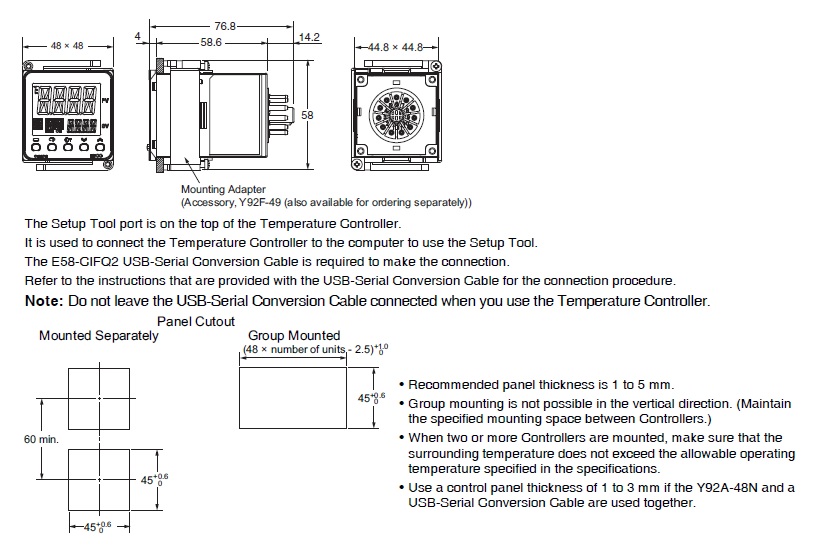 Sold separately | USB Serial Conversion Cable: E58-CIFQ2Adapter: Y92F-45/Y92F-49Waterproof Cover: Y92A-48NFront-connecting Socket (11 Pins): P2CF-11Front-connecting Socket with Finger Protection (11 Pins): P2CF-11-EBack Connecting Socket (11 Pins): P3GA-11Protective Cover for finger protection: Y92A-48GHard Front Cover: Y92A-48HSoft Front Cover: Y92A-48DCX-Thermo Support Software: EST2-2C-MV4 |